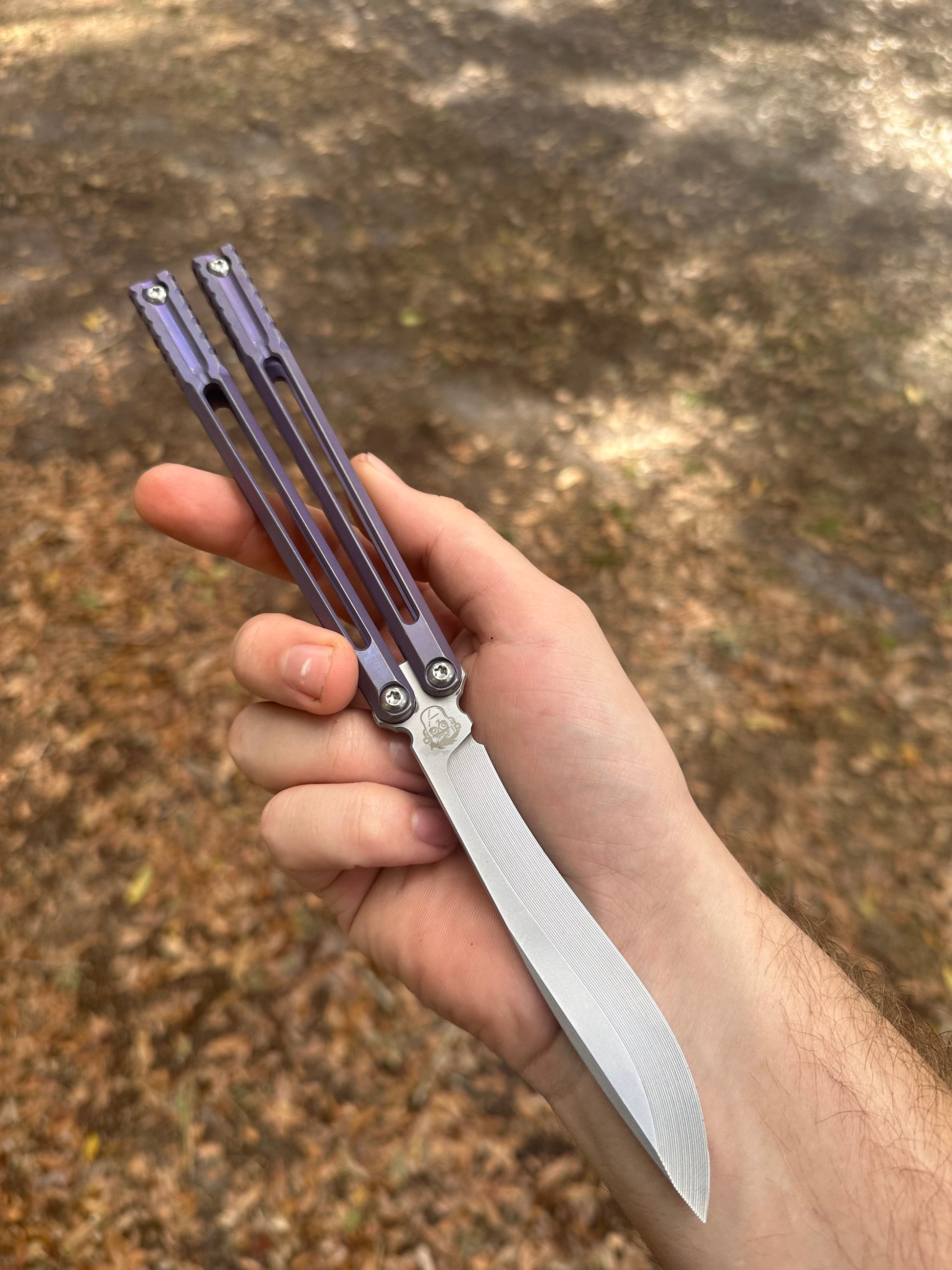 The Voltaic is my first titanium balisong, built with a chanwich construction and designed for customization. It weighs 3.75 oz with weights installed and features a pin weight system that lets you add brass pins to the back of the handles to fine-tune the balance.
